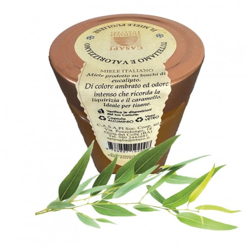 Hergestellt in der Gegend von Scanzano, Policoro, im Monat Juli. Er besitzt eine leicht bernsteinfarbene Farbe sowie einen typischen Duft und Geschmack der Eukalyptusbäume dieser Region – zu Recht gilt er als einer der besten Honige Italiens.